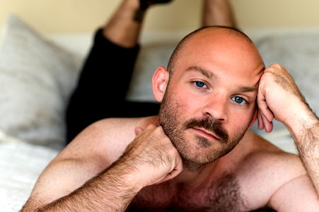 A fit, shirtless man sits up on a bed, looking directly at the camera with a beard. He appears to be taking a selfie, captured from the waist down.