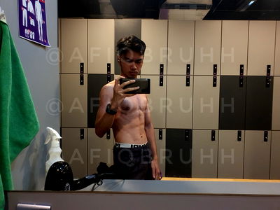 In this image, AfiqBruhh is captured in a moment of fitness, standing confidently in front of a mirror at a gym. He's dressed casually in sportswear, ready for his workout session. Behind him, a locker room filled with various sports equipment can be seen, suggesting that he might have finished his workout and taken a selfie to document his progress.