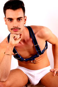 A handsome, shirtless man with a beard in a jockstrap pose confidently for the camera. His tattoos hint at an adventurous spirit. He is wearing only a harness, emphasizing his fit physique. The image suggests he might be a model or performer from OnlyFans based on the background information.