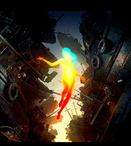 This is a stunning piece of artwork capturing a futuristic female character amidst an urban landscape filled with technology and destruction. The use of color is striking, with the woman's outfit contrasting against the gritty background. The image exudes a sense of adventure and resilience, fitting for a science fiction narrative.
