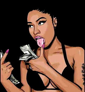 This is an illustration of Afrodita, a character from pop culture known for her unique style and confidence. She's wearing a bikini and adorned with large hoop earrings, embodying the fashion-forward spirit of the character. The image also features a playful touch, as Afrodita is holding a stack of money while licking one finger. This adds an element of humor to the artwork.