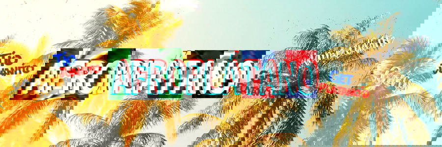A lively, colorful image of a tropical palm setting with the words 'AFROPLATANO' prominently displayed, indicating an association with a model from Atlanta, GA. The word 'Afroplatano' is highlighted and suggests a theme or category related to African-American culture and creativity.