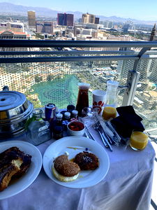 Enjoy a hearty breakfast spread on a high-rise balcony overlooking the vibrant city. The table is set with an assortment of delectable dishes and refreshing drinks, ready to start your day in style. A perfect mix of indulgence and relaxation awaits you.