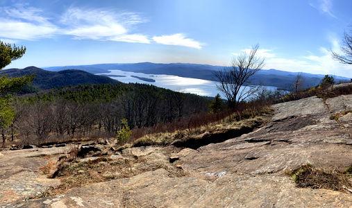 This picturesque scene captures a moment on a hiking trail set against the backdrop of a mountainous landscape. The trail, flanked by lush greenery and rock formations, offers a peaceful escape from the bustling city life. A serene lake nestles in the distance, reflecting the tranquility of the surroundings. Overhead, a clear blue sky stretches out, adding to the idyllic atmosphere. The perspective of the photo, taken from the top of the trail, provides a comprehensive view of this outdoor paradise.