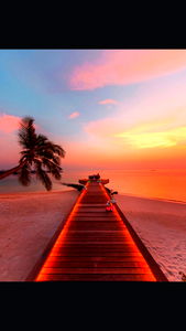 A breathtaking scene of a tropical beach sunset, with a vibrant sky and a serene horizon. A wooden boardwalk leads to the shore, inviting viewers to imagine the tranquility of a relaxing getaway.