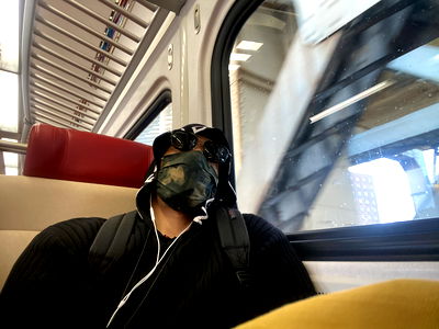 In the image, a model is captured in a moment of tranquility on public transit. The model, donned in a face mask and sunglasses, seems to be in deep thought while gazing out the window. The blurred background and passing train suggest that this could be a scene from their daily commute or perhaps an early morning photoshoot.