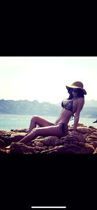 This image features a model posing on the beach with a scenic background. The model is wearing a bikini and is captured in a relaxed pose, lying down. The location appears to be a tropical beach setting. Please note that this description focuses on the visual content of the image.