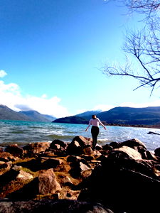 Young woman with dark hair, glasses and a necklace lying down in a room. She has a neutral expression and is resting her head on her hand.