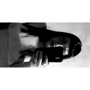 A woman is captured in the moment of taking a mirror selfie. She is dressed casually with a black and white tank top, her long hair cascading down, and she holds a smartphone in her hand. Her confident pose suggests a playful and modern style.