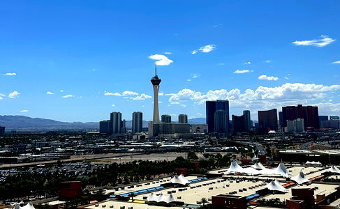A bird's eye view of the bustling Las Vegas skyline, with iconic landmarks like the Flamingo and Caesars Palace. The cityscape is bathed in sunlight, creating a vibrant and lively atmosphere.