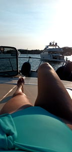 Enjoy a moment of relaxation with Agz80. She's wearing a blue bikini and lying on the boat, surrounded by a serene lake. Her gaze is directed towards the camera, capturing her in this candid shot. This image is perfect for your content related to beach, summer, travel, and fashion.
