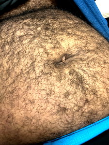 In the image, a person is showing off their belly area. The individual has a visible stomach that is hairy and ungroomed, revealing their underwear is blue. The background is not clear enough to make out any details. This is an OnlyFans photo with the model name u5834356.