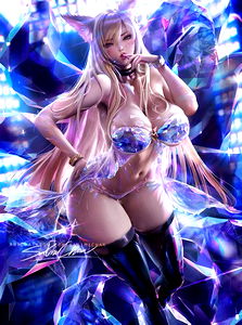 A captivating digital artwork featuring an Ahri Moon character, showcasing her in a dynamic pose with an intricate and futuristic background. This image is a testament to the fusion of fantasy and science fiction, with the character's detailed attire and accessories complementing the overall composition.