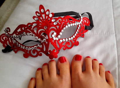 Mariana, a stunning OnlyFans model, showcases her elegantly painted toe nails alongside a red Venetian mask. Her manicure is perfectly executed, highlighting her attention to detail. The photo captures the essence of glamour, beauty and allure.