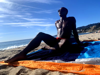 Aidan Eden, known for his fitness and modeling, is showcasing his toned physique on a sunny beach. His stylish swimwear and confident pose make him the center of attention in this vibrant setting.
