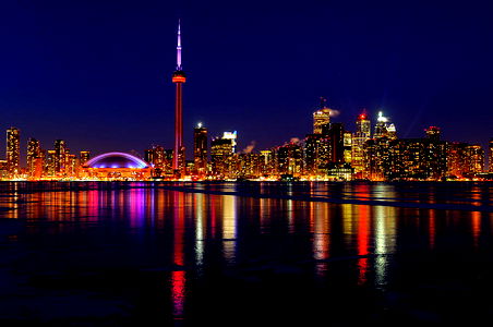 Experience the vibrant energy of Canada's largest city, captured in this stunning nighttime shot. The iconic CN Tower and illuminated skyscrapers overlook a serene harbor bathed in the warm glow of streetlights and reflections on the calm water.