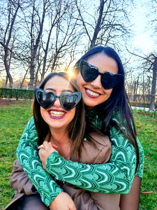 Candid snapshot of Aidyl enjoying a sunny day outdoors with a friend, sharing a warm hug. The focus is on their cheerful smiles and stylish sunglasses.