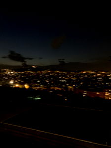 The photo captures a serene evening in a bustling city, where the twinkling streetlights and building illuminations create a mesmerizing skyline. The scene is devoid of any human activity, adding to its calmness.