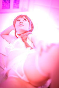 This image captures the allure of Tokyo's famous cosplay culture. In the center of the frame, a model with striking red hair is seen immersed in a vibrant pink light. The model's outfit appears to be inspired by anime or cosplay aesthetics, adding a touch of whimsy and youthful energy to the scene. The backdrop features a neon-lit wall adorned with an array of colorful lights, creating an atmosphere that is both energetic and visually striking. A blurred figure in the background suggests the presence of other attendees at this event, hinting at the popularity of this gathering. The model's pose, combined with the dynamic lighting, results in a captivating image that encapsulates the essence of Tokyo's cosplay subculture.