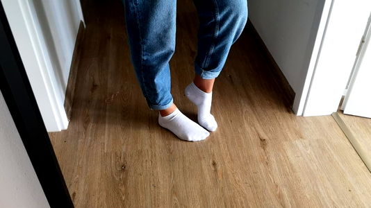 This image features a model with blue jeans, showcasing white socks on a rug. The model is standing, facing away from the camera, and has a neutral expression. A clear and detailed description of the image would be necessary for SEO purposes.