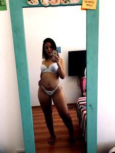 The image showcases Ailen, a model known for her expressive and confident persona. In this particular photo, she is captured in front of a mirror, posing confidently in a bikini. The background features a simple white wall and a wooden floor, keeping the focus on her. Her pose suggests a sense of style and self-assurance.