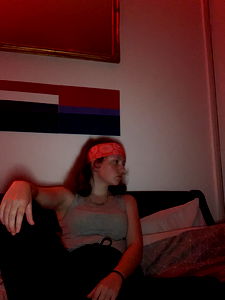 A young woman with long hair wearing a tank top and a headband is seen sitting on the edge of a bed, leaning against the wall. The room has a modern aesthetic with red lighting creating an intimate atmosphere. A large portrait hangs behind her, adding to the contemporary feel. There's a small flag with stripes in the background.
