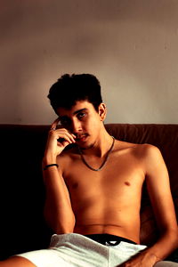 A young man, known for his fashion and lifestyle content, takes a selfie in his personal space. He is seen shirtless with a casual pose. A blue phone he uses to interact with fans can be spotted in the background.