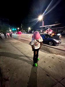 This image captures an urban night scene with a figure dressed as a clown in pink hair standing on the sidewalk. The individual is holding a phone, possibly engaged in conversation or browsing. The environment shows parked cars, traffic lights indicating an intersection, and some pedestrians nearby.