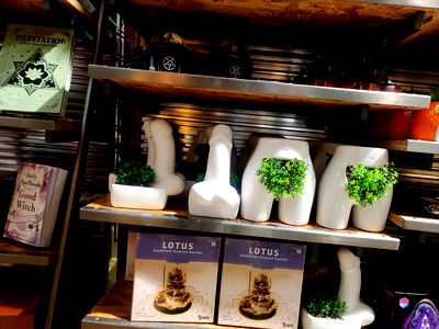 A cluttered shelf with vases, books, and assorted items, showcasing a lack of organization within the shop.
