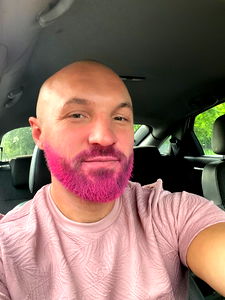 The image shows a man with an unconventional hairstyle, featuring bright pink hair and beard. He appears to be in the passenger seat of a vehicle, dressed in a casual top with a light color. The man is looking directly at the camera, suggesting he may be posing for this picture. His choice of pink hair stands out as a bold fashion statement. The background outside the car window suggests an outdoor setting.