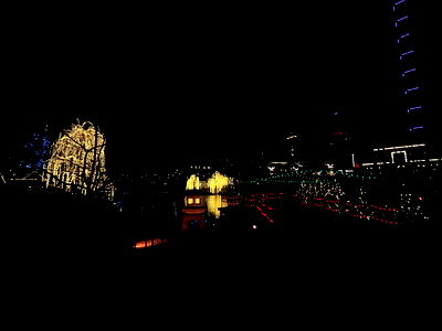 An urban nightscape featuring colorful lights in a city setting, possibly a holiday display or illuminated buildings. The lighting creates a festive and vibrant atmosphere.