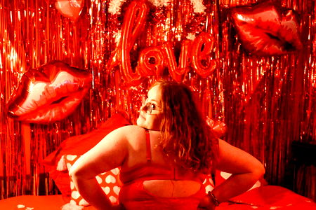 An Onlyfans model in a vibrant red bra and underwear, striking a pose against a disco ball backdrop.