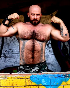AITOR CRASH, a fitness model from Europa, showcasing his impressive physique in this promotional shot. Wearing a sleek, fitted outfit and sporting tattoos that add to his rugged appearance, he exudes an air of confidence and strength.