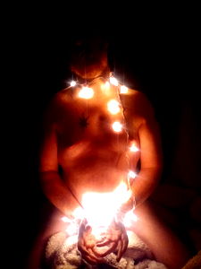 This image is a playful and creative spin on holiday festivities, featuring a model dressed in a unique garment with glowing lights. The model seems to be enjoying the experience, capturing the spirit of the season. The lights create a warm and inviting atmosphere, making it a visually appealing image.