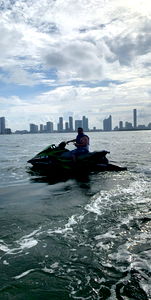 A dynamic scene of a person enjoying a day out on the water, riding a jet ski under a clear sky.