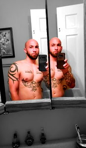 A man with tattoos captures his physique in the mirror. He's shirtless, flexing his muscles and showcasing his ink. The background is minimalistic, emphasizing the subject's toned form.