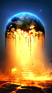 This image showcases a vivid scene where an erupting volcano sends flames and debris flying, with a planet hanging above the chaos. The artwork is rich in detail, from the molten lava to the rocky terrain beneath it. It's a powerful representation of natural disasters set against a backdrop of cosmic wonder. A perfect blend of fiery destruction and celestial serenity.