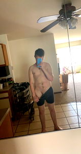 An OnlyFans model captures an intimate moment of his shirtless physique, standing in front of a mirror. His toned muscles are on display against the backdrop of a domestic kitchen scene.