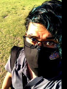 Aj, a young adult with colorful hair, is enjoying a day out at the park. He's wearing a blue and white face mask, perhaps as a precaution or to protect his vibrant hairstyle from the elements. With his backpack slung over one shoulder, he appears ready for an adventure.
