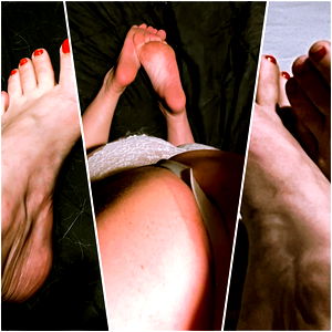 California-based OnlyFans model showcasing foot fetish content. The image features a person's feet with painted toenails and red nail polish, laying on a bed with one foot propped up. Age 26, Gender Female.