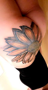 A captivating image featuring a full back tattoo. The central piece is a stunning sunflower with detailed petals and a vibrant yellow sun at the center. The artwork is complemented by a black outline that brings out the intricate details. This impressive design covers a significant portion of the back, making it a striking focal point.