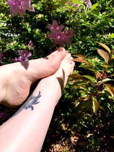 This image captures the essence of Akia Rose, a tattooed individual enjoying a relaxing moment in nature with a single cherry blossom adorning their toes. The tranquil setting is further enhanced by the soft focus and natural lighting that creates a serene atmosphere.