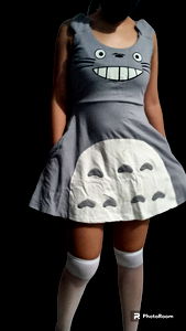 In the image, a model named Akiiza is seen wearing a chic Totoro-themed outfit that includes a gray dress and matching socks. The model stands confidently against a dark background, showcasing their unique fashion style. Akiiza's dedication to cosplay is evident in this photograph.