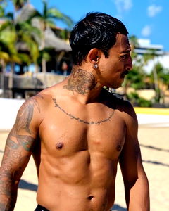 AkikunXXX, a model based in Cabo San Lucas, Mexico, showcases his fit body on the beach.