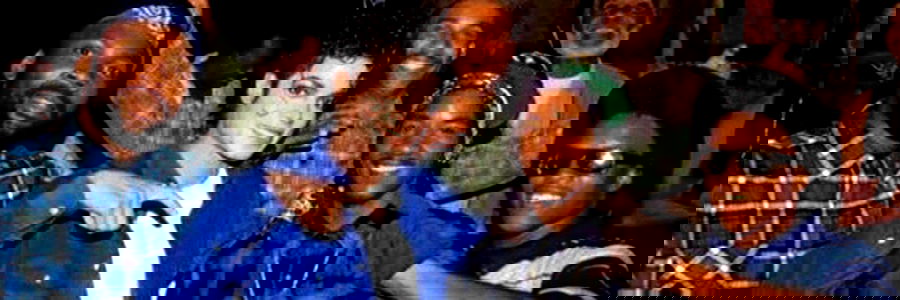 Akil, an OnlyFans model, strikes a fun pose with friends. The backdrop is busy but the group stands out.