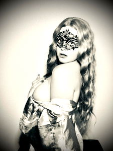 The image is a black and white photograph of a woman with an expressive facial expression. She appears to be in a performance or theatrical setting, as indicated by the mask she is wearing and her dramatic pose. The woman has voluminous hair, which is curled and styled, and her makeup is done in such a way that it accentuates her features. Her clothing is minimalistic, with the focus on her face and the mask. She has a hand near her mouth and is looking directly at the camera. The background is neutral-toned and does not distract from the subject.