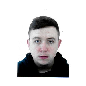 The image showcases a model with short hair, wearing a black hoodie. The individual is looking directly at the camera with a neutral expression.