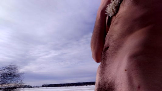 A shirtless man wearing a dog costume is seen standing in the woods with his hands on his head, possibly posing for a photo. His attire adds a whimsical touch to the otherwise natural setting.
