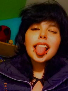 In the image, we see a young woman displaying a playful and rebellious style. She has multiple piercings, a dyed black hair, and is making an exaggerated tongue gesture. The background suggests a casual indoor setting, possibly a bedroom or living space. Her outfit appears relaxed with a dark top. The overall vibe of the photo conveys youthfulness, individuality, and modern fashion trends.