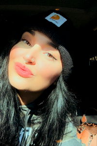 The photo showcases a woman with a radiant smile, posing for the camera. She is wearing a black beanie and a jacket that suggests a cool climate. Her attire also features casual elements like a T-shirt and jeans. The background of the image is blurred, making it difficult to discern any specific details. The focus on the model and her outfit suggests she might be showcasing fashion or streetwear styles.
